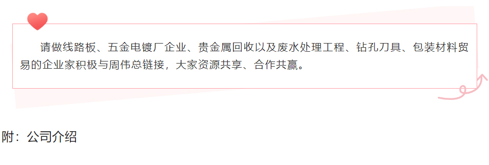 期望合作:线路板、五金电镀厂企业、贵金属回收以及废水处理工程、钻孔刀具、包装材料贸易
